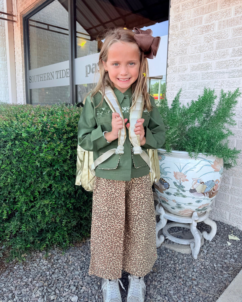 Style Overload! We are wild about our Girls Wylie Jacket in Four Leaf Clover. This special Fall piece is loaded with fashion forward details like a moss green sequined accent across the chest and back, leopard trimmed pockets and a chambray accent on the inside of the pocket and beneath the collar. Wear with our Wylie Pant